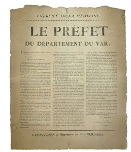 VAR. « EXERCICE DE LA MÉDECINE. » (Titre) - Arrêté du Préfet du VAR relative à l’exercice de la Médecine. (en 21 articles.). Fait à DRAGUIGNAN, à l’Hôtel de la Préfecture, le 11 Prairial An XI (31 Mai 1803) –