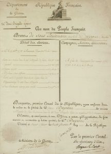 P.S. BONAPARTE (Secrétaire) contresignée Alexandre BERTHIER Ministre de la Guerre & Hugues MARET Secrétaire d’État. -