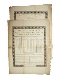 1°) « NOUVEAU BARÈME DU FRANC indiquant la somme à payer en Livres tournois pour s’acquitter des objets payables en francs. Extrait de la Loi du 17 Floréal An 7, qui change la manière de compter les pièces de monnaie d’or et d’argent, dans les caisses publiques et dans le commerce, à dater du premier vendémiaire An 8 (23 Sept 1804) +
