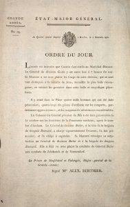 L’Armée est instruite que Custrin s’est rendu au maréchal Davout… Sa Majesté a vu avec plaisir le Corps de cette Division, qui s’est tant distingué à la Bataille de IENA… » -