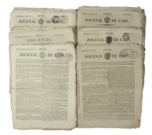 « JOURNAL DE L’AIN » ou « JOURNAL DU DÉPARTEMENT DE L’AIN » - 114 Numéros de ce journal d’affiches, annonces, et avis divers du Département de l’Ain, imprimés chez JANINET, 19 rue Notre-Dame à BOURG (01) – de 1814 à 1815 (dont la...
