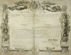 P.S. de la griffe de CHARLES PHILIPPE de France, Comte d’Artois (Futur Charles X), contresignée du Duc de MONTMORENCY l’aide-Major Gal, Président, Pair de France & Gilbert de Voisins Secrétaire Gal, commissaire au Sceau –