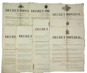 8 PLACARDS des CENT-JOURS. RHÔNE.) – « DÉCRET IMPÉRIAL. LYON, Le 13 mars 1815. NAPOLÉON, par la grâce de Dieu et les Constitutions de l’Empire, Empereur des François » (Chaque placard avec entête et vignette à l’Aigle impérial. Impr....