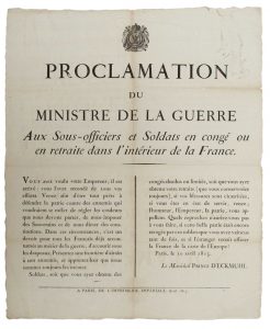 (LES CENT-JOURS. Retour à PARIS de NAPOLÉON..) « Proclamation du Maréchal D’AVOUT Prince d’Eckmühl, Le Ministre de la Guerre, aux Sous-officiers et Soldats en congé ou en retraite dans l’intérieur de la France » -