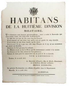 (LES CENT-JOURS. Retour de NAPOLÉON. BOUCHES-DU-RHÔNE.) Adresse du Maréchal d’Empire MASSÉNA Le Prince d’ESSLING, aux Habitants de la 8° Division Militaire, à TOULON (83) le 10 Avril 1815. Publié à MARSEILLE (13) le 11 avril 1815 –