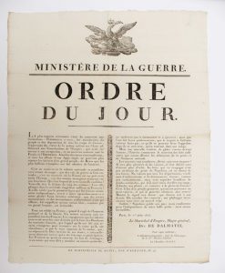 « La plus auguste cérémonie vient de consacrer nos Institutions …par l’Acte additionnelle aux Constitutions de l’Empire, qui avait été envoyé à son acceptation, et un nouveau serment unit la France et l’EMPEREUR… Soldats ! NAPOLÉON guide nos pas ; nous combattons pour l’indépendance de notre belle patrie : nous seront invincibles. » -