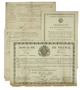 •P.S. DESMICHELS, Colonel Président – Impr. 1p in-4° + 3) Place de PAU (64) 25 Nov. 1815 – Feuille de Route de Sous-officier du 4° Régiment de Chasseurs à Cheval, pour se rendre dans l’Isère (nombreux visas) – 4pp in-folio + 4) Grenoble 6 Sept 1815 – •Ordonnance du Préfet de l’Isère sur l’organisation des Légions départementales concernant GÉRIN –