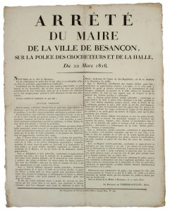 DOUBS – Arrêté du Marquis de TERRIER-SANTANS, Maire de la Ville de BESANÇON, sur la Police des Crocheteurs de la Halle, du 22 Mars 1816 – En 10 articles :