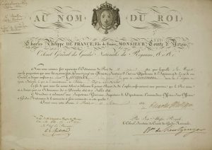 Pièce Signée “CHARLES-PHILIPPE de France, Fils de France, MONSIEUR, Comte d’ARTOIS, Colonel Général des Gardes Nationales du Royaume” (En-tête imp., vignette royale) - Brevet 1p (40 x 28, 5) en partie imp.-