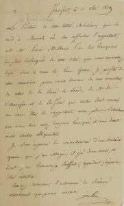 « Le porteur, de cette lettre, monsieur, qui se rend à Munich où des affaires l’appellent, est M. Henri MULHEUS, l’un des banquiers les plus distingués de cette ville, que vous connaissez déjà sous le nom de Henri GREEN. Je profite de cette occasion pour vous donner de mes nouvelles, de celles de la Reine de Suède (Bernadotte), de Mr de Villeneuve et de sa fille, qui toutes sont venues me voir. Elles se rappellent avec plaisir l’attachement que vous leur avez témoigné, et vous disent mille choses obligeantes. Je sors à peine de convalescence d’une maladie grave que j’ai essuyée, il y a deux mois, et dont j’ai beaucoup souffert, cependant j’espère en être rétablie… » -