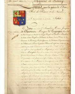(AISNE - BLASON PEINT) – « MAJORAT de BUZANCY (02) » pour le sieur Amand Marc Jacques de CHASTENET Marquis de PUYSÉGUR, le 30 Avril 1822 –