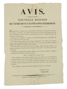 (SAVOIE. 1822. CHEVAUX) – « AVIS. Nouvelle défense de tenir des Étalons sans permission. » Fait à CHAMBÉRY, au bureau de l’intendance de SAVOIE, le 11 Mai 1822 –