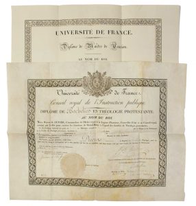 (PROTESTANTISME) – 2 Diplômes « UNIVERSITÉ DE FRANCE. Conseil Royal de l’Instruction publique. Diplôme de Bachelier en Théologie PROTESTANTE pour Louis Auguste DUCROS, né à Nîmes (Gard) – Fait à PARIS le 4 Octobre 1825 -