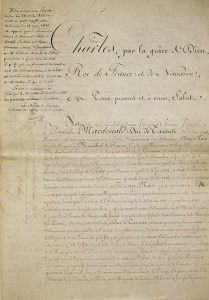 •Lettres d’investiture du Majorat-Paierie-Duché, avec pension, de Jacques Étienne Joseph Alexandre MACDONALD Duc de TARENTE, né le 17 Nov. 1765 à SEDAN (Ardennes) Duc et Pair de France, Maréchal de France. Donné au Château de St Cloud le 7 Septembre 1826.