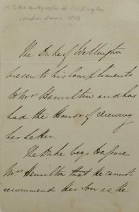 « The Duke of WELLINGTON » présente ses compliments à M. HAMILTON mais il ne peut pas recommander son fils qu’il ne connaît pas personnellement. -