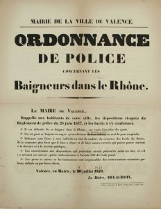 DRÔME – « Ordonnance de police concernant LES BAIGNEURS DANS LE RHÔNE. » De VALENCE, en Mairie, le 9 Juillet 1841 -