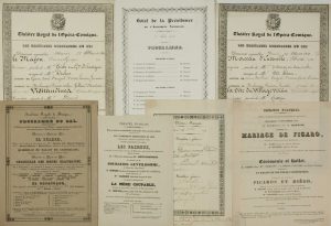 Imprimés in-8°, in-4°, Typo Vinchon, certains remplis à l’encre → On y joue Molière, le mariage de Figaro de Beaumarchais, Rossini, etc.… -