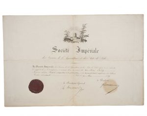 LILLE (59) – BREVET de membre de la SOCIÉTÉ IMPÉRIALE Des SCIENCES, De L’AGRICULTURE et Des ARTS de LILLE, avec vignette à la Ruche & aux Abeilles – Adressé à M. Léon RODET Inspecteur de la Fabrication à la Manufacture Impériale des...