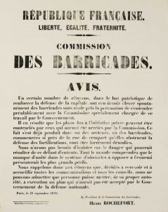 «AVIS. Un certain nombre de citoyens, dans le but patriotique de renforcer la défense de la capitale, ont cru devoir élever spontanément des barricades sans avoir pris la précaution de s’entendre préalablement avec la Commission spécialement chargée de ce travail par le Gouvernement… de la défense Nationale. » –