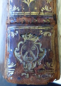 veau marbré ancien, dos orné à nerfs, armes en queue, p. de titre verte et rouge.