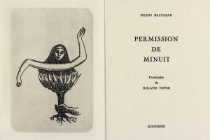 Édition originale ornée, en frontispice, d'une eau-forte originale de Roland Topor.#Tirage à 200 exemplaires. — Un des 60 exemplaires du tirage de tête sur papier Kozo-Shoin du Japon comportant le frontispice de Topor tiré sur le cuivre (eau-forte originale), signé par Baltazar et par Topor. Dans les exemplaires sur papier vélin de l’édition, l’eau-forte est en reproduction. #Sur le faux-titre, cachet gras à l’encre rouge : « L’auteur parti poster son courrier revient de suite Roland Topor » et dédicace autographe au crayon : « … et vous donnera aussi la Permission de minuit. Pour ma part je serai de retour bien après 23 h ! (Non ! je ne suis pas à la Poste !). Amitiés de Julius aux Vidalenches ».#