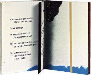 Les sept ouvrages suivants d’Yves Bonnefoy forment une suite voulue par le poète. Chaque volume produit à 10 exemplaires sur papier vélin de Rives est signé par l’auteur et par l’artiste. Bertrand Dorny en a assuré la réalisation matérielle, tamponnant le texte à la main mot après mot, découpant, assemblant, collant ou cousant différents matériaux et projetant le coloris à l’aérographe. Un CD joint à chaque livre permet d’entendre l’auteur dire son texte.#1. Vous, encore ! Paris, mai 2002 ; plaquette petit in-4 (285 x 180 mm) de [20] ff. montés en accordéon, le premier, les deux derniers et les versos blancs, couverture et étui décorés. Bandes de papiers de fantaisie collées ou flottantes, bandes intercalaires cousues, de rhodoïd, de suédine, de papier métallisé, zones peintes à l’aérographe, etc.#2. Ce bruit, Qu’est-ce que c’est ? Paris, 2010 ; plaquette petit in-4 (285 x 180 mm) de [16] ff. montés en accordéon, le premier blanc recouvert sur une face de basane fauve, les trois derniers et les versos blancs, couverture revêtue de basane fauve (le premier plat), étui décoré. Bandes de rhodoïd, de papiers de fantaisie ou métallisés, collées ou flottantes, bandes intercalaires cousues, rehauts de couleurs à l’aérographe.#3. Et ça, encore ? Paris, 2010 ; plaquette petit in-4 (285 x 180 mm) de [16] ff. montés en accordéon, le premier, les deux derniers et les versos blancs, couverture décorée, étui. Bandes de papiers de fantaisie collées ou cousues, bandes intercalaires de rhodoïd, de papier métallisé, zones peintes à l’aérographe, etc.#4. Plus loin, Plus loin ! Paris, juin 2011 ; plaquette petit in-4 (285 x 180 mm) de [12] ff. montés en accordéon, le premier, les trois derniers et les versos blancs, étui. Bandes de papier de fantaisie, métallisé, plaques de rhodoïd, de carton décoré cousues, rehauts de couleurs à l’aérographe, etc.#5. La Grande Ourse. Paris, 2011 ; plaquette petit in-4 (285 x 180 mm) de [16] ff. d’un seul tenant montés en accordéon, le premier blanc recouvert au verso d’une pièce de basane fauve, les trois derniers et les versos blancs, la couverture recouverte de basane fauve (le premier plat), étui recouvert de même peau. Bandes de papiers de fantaisie, métallisé, de suédine, plaques de rhodoïd, rehauts de couleurs à l’aérographe.#6. Allô, oui ? Paris, février 2012 ; plaquette petit in-4 (285 x 180 mm) de [20] ff. montés en accordéon, le premier, les trois derniers et les versos blancs, couverture blanche, étui. Plaques de rhodoïd et découpes de soie imprimée, de suédine, de papiers de fantaisie peints, métallisés, luminescents sous forme de bandes collées, flottantes ou intercalaires avec rehauts de couleurs à l’aérographe.#7. L’Étoile Sept. Paris, août 2012 ; plaquette petit in-4 (285 x 180 mm) de [16] ff. montés en accordéon, le premier, les trois derniers et les versos blancs, couverture décorée, étui. Découpages de papiers de fantaisie, de plaques de rhodoïd, de papier métallisé avec rehauts de couleurs à l’aérographe, languette intercalaires cousues, etc.