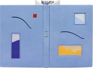 plat deux cadres pivotants de polycarbonate transparent enfermant du sable colorié bleu, jaune ou indigo, barrette courbe de box outremer, dos lisse avec titre poussé à l’œser outremer, doublures bord à bord de même box, gardes de chevreau gris, non rogné, couverture et dos, chemise-boîte de même box (B[rigitte] B[enoist]. 2006).