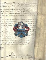 gouachées au centre / Lié à ce document par un cordon vert et rouge, règlement d’armoiries sur vélin signé d’Antoine Marie d’hozier de Sérigny, sceau sous papier, fragment de sceau de cire pendant, avec les dites Armoiries gouachées - Bel ensemble