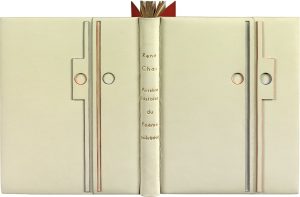 géométrique vertical en creux et en relief avec deux perforations, chants de box bleu ou rouge, dos lisse avec nom et titre en lettres dorées, doublures bord à bord de box bleu nuit, gardes de daim rouge, tranches dorées sur témoins, couverture et dos, chemise à dos et bandes de même box, étui (P[ierre]-L[ucien] Martin. 1970).
