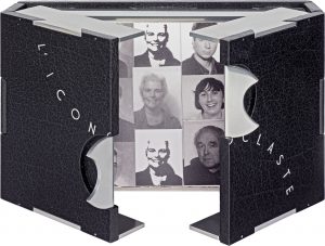 DEGUY (Michel). L’Iconoclaste. Paris, février 1998. Plaquette in-12 oblong (112 x 160 mm) de [13] ff. montés en accordéon avec versos blancs, couverture illustrée de 15 portraits photographiques, non rogné, contenu dans un étui-boîte très...