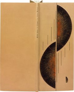 demi-disques mosaïqués en relief dans le prolongement l’un de l’autre (et un autre très petit) : peau à fond orangé et pointillé noir, filets dorés verticaux, doublures et gardes de daim feuille-morte, dos lisse, titre et noms en long, entièrement non rogné, couverture illustrée à rabats et dos (A[lain] Lobstein. 1997).
