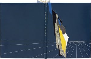 palladium rayonnant sur 180 degrés, sur le plat supérieur importante composition de pièces incrustées, mosaïquées ou en superposition de maroquin, de lézard, de box et de papier métallisé granité noir, gold, gris, bleu, doublures et gardes de daim bleu lavande, tête dorée, couverture et dos, chemise à dos et bandes de même box, étui (Alain Devauchelle. 1990).