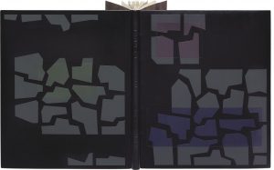 bleu nuit, gris anthracite, vieux rose, vert glauque, en relief sur les plats (avec rectangles en creux), dos lisse, titre à la chinoise poussé à froid, doublures et gardes de daim marron, entièrement non rogné, couverture et dos, chemise à dos et bandes de même box, étui ([Georges] Leroux. 1985).