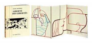 JOUFFROY (Alain). Liberté des Libertés. Dessins de Miró. Paris, Le Soleil noir, décembre 1971. In-12 (190 x 140 mm) de 184 pp., broché, couverture illustrée rempliée, étui noir contenant aussi un triptyque sur carton épais.