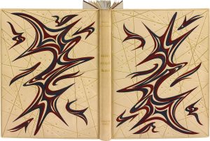 ornés de filets dorés entrecroisés mêlés d’étoiles dorées et d’importants motifs abstraits mosaïqués de box bleu et rouge, doublures et gardes de daim chamois ces dernières bordées d’un fin ruban de box rouge, ébarbé, tranches dorées, couverture et dos, chemise à dos et bandes de même box, étui (Paul Bonet. 1955).