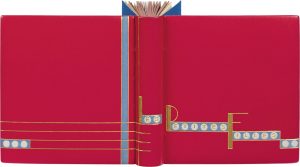 mosaïquées de box bleu lavande portant le titre en lettres dorées sur pastilles de box gris clair, sur le plat inférieur, bande verticale mosaïquée de box bleu lavande, quatre filets dorés horizontaux enfermant une courte bande de trois pastilles, doublures et gardes de daim outremer, tranches rouges, couverture et dos de papier de fantaisie extra-fin avec étiquette de titre, chemise à dos de même box, étui (C[olette] et J[ean]-P[aul] Miguet, 1986).