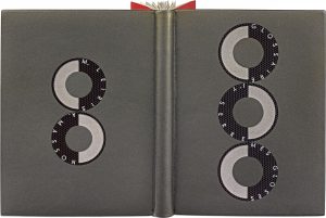 ancienne de box gris éléphant verni, sur le plat supérieur trois cercles mosaïqués à demi arasés portant le titre en lettres blanches, sur le plat inférieur deux cercles mosaïqués portant le nom de l’auteur, dos lisse muet, doublures et gardes de daim rouge, couverture illustrée et dos, chemise et étui (A[lain] Devauchelle).