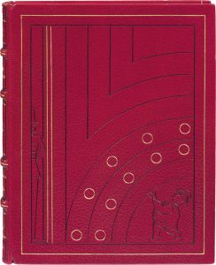 décor de filets droits et courbes dorés et à froid, cercles dorés, sur le plat supérieur, deux personnages esquissés à froid, dos à nerfs orné de cercles et motifs dorés et à froid, filet doré intérieur, non rogné, tête dorée, couverture et dos, étui (V[ictor] Granghaud).
