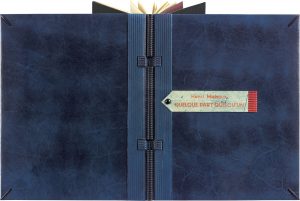 polie bleu nuit, étiquette en forme de flèche avec rivet d’ébène, nom et titre en lettres rouges sur fond vert pâle, barrette d’ébène aux angles, bordure aux mors de veau gaufré « lignes fines », dos de veau bleu nuit gaufré « petits carrés », couture sur deux lanières de même matériau, doublures de peau fine poncée teintée en bleu, non rogné, couverture et dos, étui-boîte à dos de box gris, titre en lettres bleues, doublures de daim bleu nuit (Jean de Gonet. 1992).