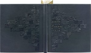 plats ornés d’une superposition de bandes horizontales de carrés en léger relief mosaïqués en même box collés sur pâte acrylique, le tout formant une croix (les deux plats étant ouverts), titre doré en cinq lignes sur le plat supérieur, doublures et gardes de porc-velours marron glacé, entièrement non rogné, couverture et dos, étui-boîte à dos de même box et doublures de même porc-velours (N[obuko] Kiyomiya. 2004).