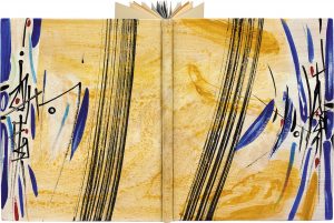 les plats et le dos — lisse — entièrement décorés à l’aquarelle par Baltazar, non rogné, couverture orange et dos, chemise à dos de maroquin châtaigne doublée de daim vert pâle, étui (Renaud Vernier).