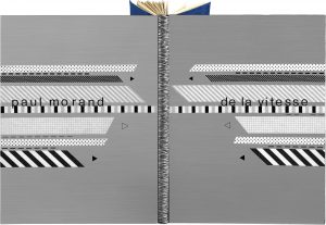 MORAND (Paul). De la vitesse. Paris, [Simon] Kra, 7 octobre 1929. In-12 carré (187 x 135 mm) de 68 pp., [1] f. (Achevé d’imprimer), 1 f. blanc, reliure à plats rapportés de polymère imitant l’acier ornés de bandes horizontales de papiers...