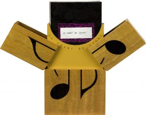 étui-boîte en trois parties s’emboîtant sur un support de bois de citronnier, box de ton paille avec grande note de musique incrustée en ébène (croche) le tout poli et verni, chemise à dos de maroquin noir et étui (Renaud Vernier maître d'art. 2004).