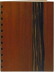 PEYRÉ (Yves). Mythologie. Cléry-Saint-André (Loiret), Jean-Jacques Sergent, novembre 2001. Plaquette in-folio (380 x 280 mm) de un f. blanc, [9] ff., un f. blanc, reliure de bois padouk à charnières doubles avec bandes verticales d’ébène de...