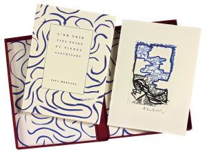 Édition originale ornée de 3 eaux-fortes originales à pleine page tirées en bleu et noir de Pierre Alechinsky, ici signées au crayon. Fac-similé d’une page du manuscrit d’Yves Peyré.#Tirage à 120 exemplaires sur papier vélin d’Arches. — Un des 40 de tête accompagnés d’une suite à part des trois gravures tirées « sur vieille paperasse notariée » et signées au crayon gras par Alechinsky.