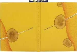ancienne de buffle jaune soleil, incrustations de lamelles de buis laqué, sur chaque plat fente oblique ajourée et greffe de même peau rehaussée d’un glacis orange, dos lisse, doublures de même peau, gardes en agneau-velours outremer, couverture peinte à larges rabats et dos, chemise à dos et bandes de même peau, étui (Renaud Vernier maître d'art. 2004. - E.D. Claude Ribal).