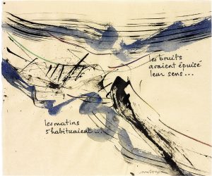 Édition originale ornée de 9 lithographies originales de Julius Baltazar dont six a pleine page et 3 à double page, toutes à fond perdu. #Tirage à 45 exemplaires sur papier vélin de Rives, accompagnés d’un fragment autographe du texte écrit sur un lavis original signé par Baltazar, celui-ci signé par l’auteur et par l’artiste.#Contenu, sous le même étui, un second exemplaire du même ouvrage aquarellé d’un bout à l’autre par Julius Baltazar, y compris la couverture et les pages de gardes. Il est signé par l’auteur et par l’artiste que ce dernier a justifié : « Exemplaire rehaussé ».