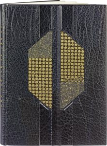 Colophon), reliure de l’époque de peau de buffle noire, sur les plats composition centrale octogonale à fond d’or en partie couverte de pastilles dorées évoquant un masque coupé par une arête verticale mosaïquée et en relief de même peau, dos lisse, titre à la chinoise, doublures et gardes de daim gris, non rogné, couverture illustrée conservée d’un seul tenant, chemise à dos de même peau et étui (A[lain] Devauchelle. 2006).