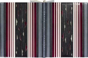 noir, les plats couverts de bandes verticales en relief : huit de box grenat sur fond de box blanc, deux — latérale — de box gris avec listel vert d’eau, grande bande centrale de même maroquin noir en partie évidée rehaussée de filets luminescents rouge et argentés, chants blancs, dos lisse de box gris avec titre à la chinoise en lettres au palladium, doublures et gardes de daim gris, non rogné, couverture et dos, chemise à dos et bandes de même maroquin, noms et titre au palladium, étui (C[olette] & J[ean]-P[aul] Miguet. 1989).