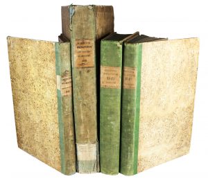 Legatura coeva in mezza tela verde con piatti in carta marmorizzata con titoli manoscritti su tasselli cartacei applicati ai dorsi, un poco lisa.(4)